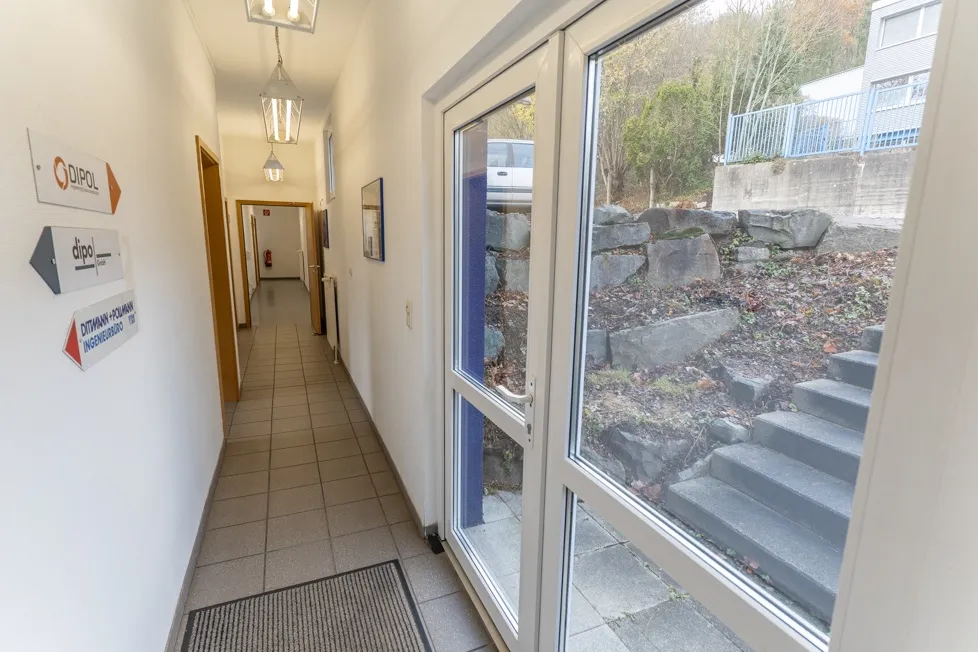 Über den leicht versetzten Haupteingang, der über wenige Stufen erreichbar ist, gelangt man in den vorgelagerten Eingangsbereich. Dieser Empfangsbereich bildet den zentralen Zugangspunkt zu den Räumlichkeiten und führt unmittelbar in die untere Bürofläche. Gleichzeitig erreicht man von hier das Treppenhaus, das sowohl die obere Büroetage erschließt als auch den rückseitig gelegenen zweiten Zugang verbindet. Diese Erschließungsstruktur ermöglicht eine ideale Trennung unterschiedlicher Nutzungsbereiche oder Abteilungen.