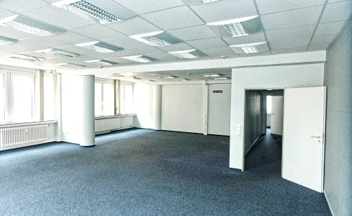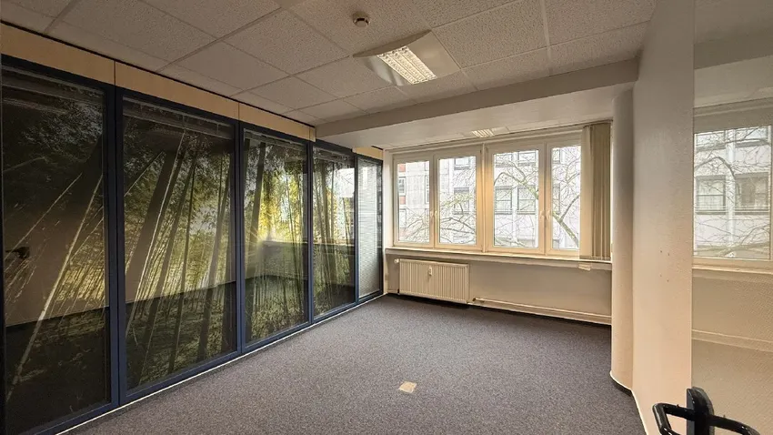 Sehr helle, gepflegte Räume, teilweise Abtrennung mit Echtglaselementen, Glasfasertapete, 4 Einzelbüros, 1 Großraumbüro, Besprechung, Teppichfußbodenoberbelag, abgehängte Kassettendecke mit Beleuchtung, DV-Verkabelung, Server-/Kopierraum, Küche, D+H WC, Aufzug, Rauchwarnmelder, Gegensprechanlage, Fernwärmeheizung.