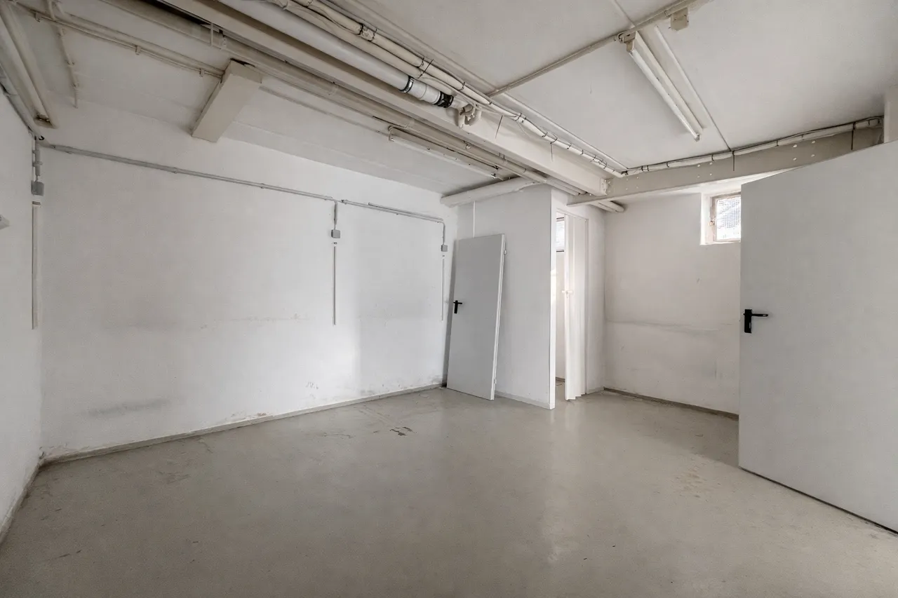 Die Nebenfläche teilt sich auf zwei, etwas höhenversetzte Räume sowie ein WC auf. Einer dieser Räume verfügt über einen Wasseranschluss und könnte somit als Küche genutzt werden, der andere als Lagerraum.