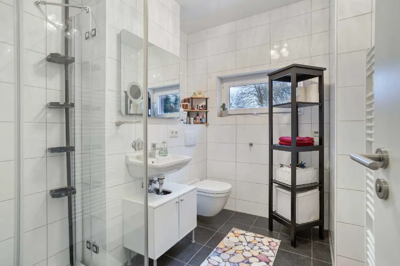 Die Wände sind großenteils glatt verputzt und weiß gestrichen. Die Böden im Erdgeschoss sind mit einem Vinylboden in Betonoptik belegt, in der oberen Etage wurde grauer Laminatboden verlegt. Beide Tageslichtbäder verfügen über weiße Wandfliesen und schwarze Bodenfliesen, einen Handtuchheizkörper und weiße Keramiken.