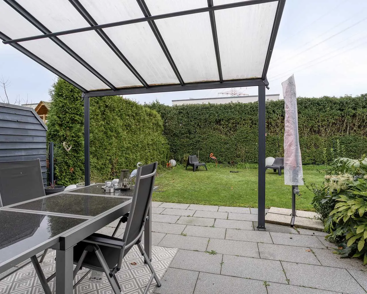 Der Garten bietet mit einer überdachten Terrasse und der sonnigen Grünzone einen perfekten Rückzugsort mit Platz zum Entspannen!