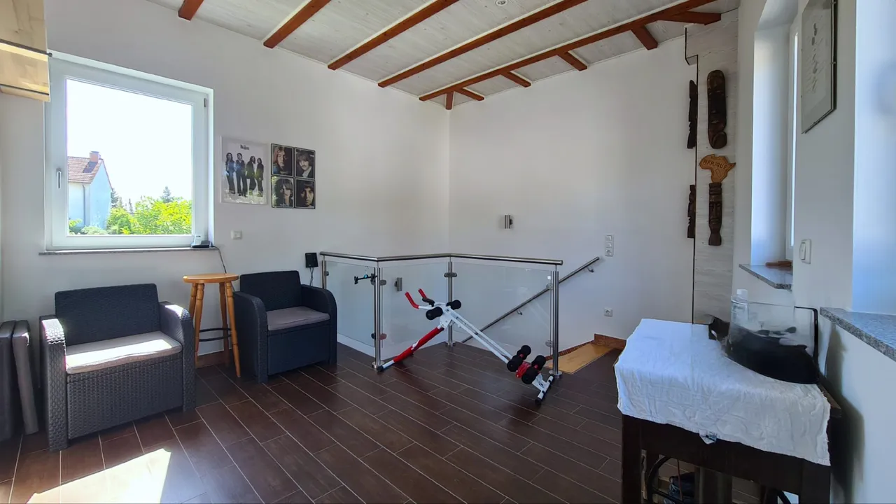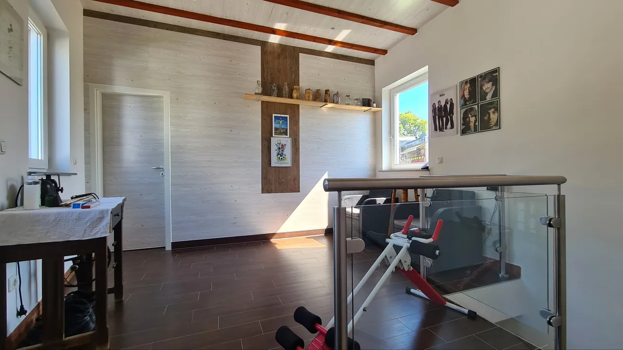 - Obergeschoss mit modernen Fliesen in Holzoptik und sichtbaren Deckenbalken