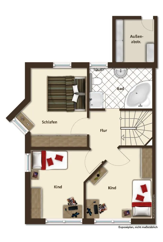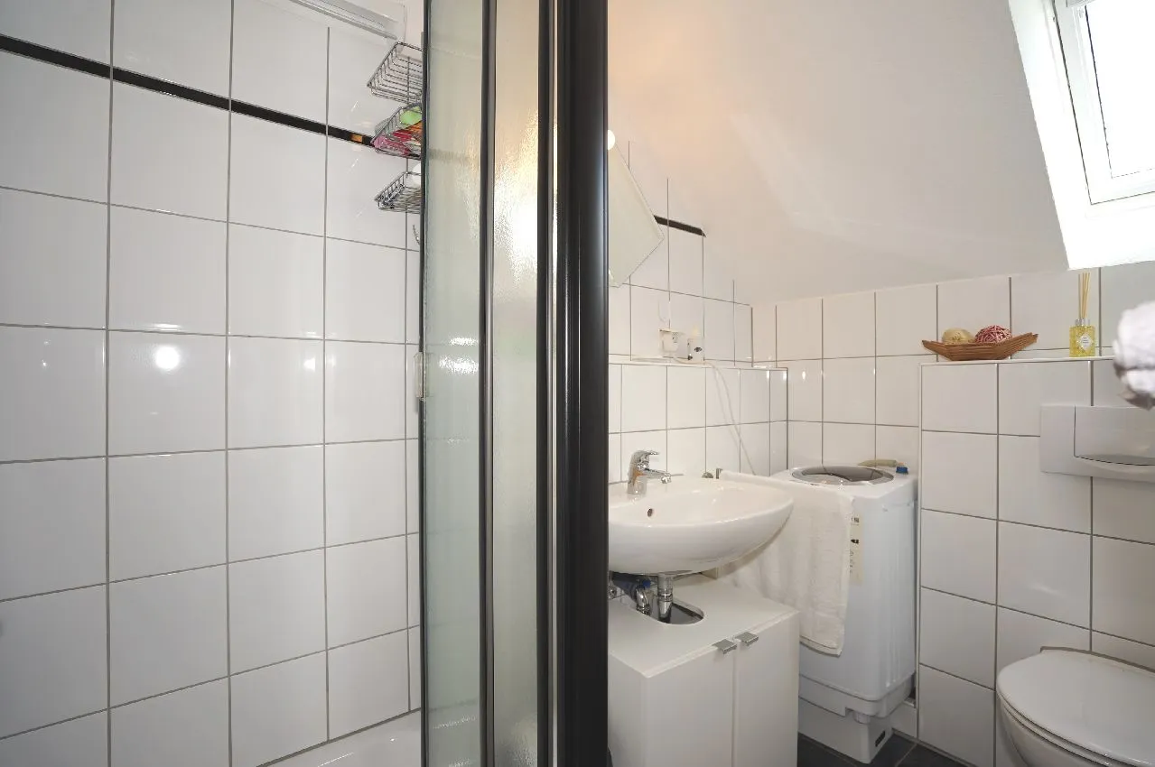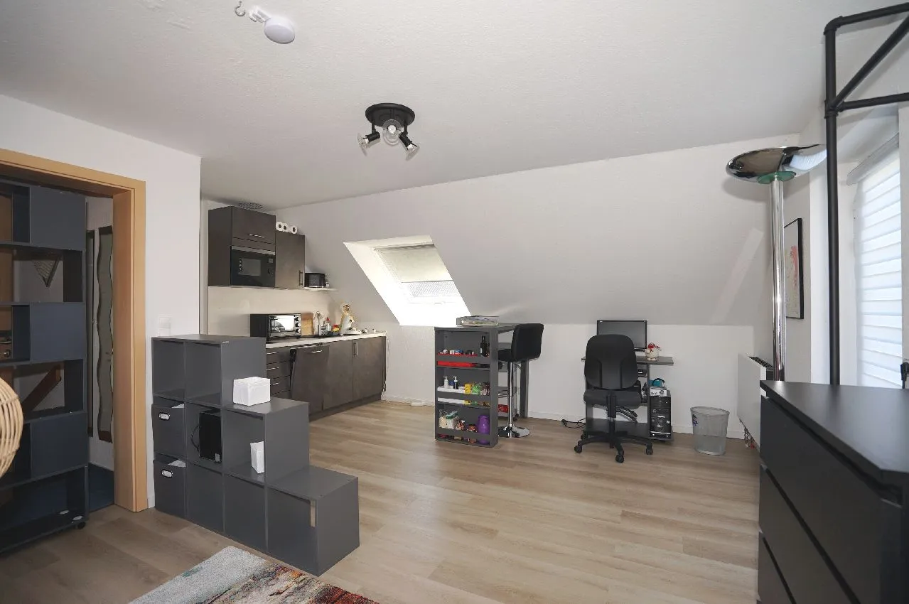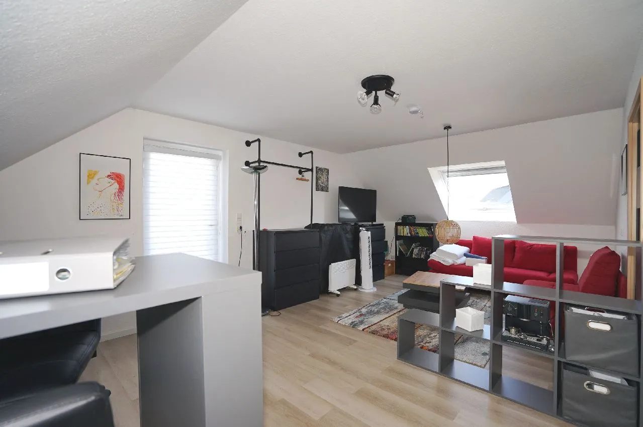 Aktuell erwarten Sie im 1. Obergeschoss 3 Räume sowie das Vollbad mit Fenster, Dusche und Whirlpoolbadewanne. Je nach Kundenanforderung können die beiden als Kinderzimmer konzipierten Räume auch zusammengelegt werden. Im ausgebauten Dachgeschoss wurde die Möglichkeit eines separaten Appartements realisiert, welches wahlweise auch über eine eigene Zugangstreppe auf der Giebelseite direkt von außen zu erreichen ist - ideal z. B. für ein Homeoffice, ältere Kinder oder ggfls auch für eine Untervermietung. Das voll eingerichtete Studio ist unterteilt in einen Wohn-/Schlafbereich, eine Küchenzeile mit Essplatz, einen kleinen Arbeitsbereich und ein kleines Duschbad, in dem auch ein Waschmaschinenplatz vorgesehen ist. Die Anbindung an das innere Treppenhaus ist erhalten geblieben, von wo aus im DG-Bereich ein weiterer Abstellraum sowie der Dachboden über die Einschubtreppe begangen werden können.