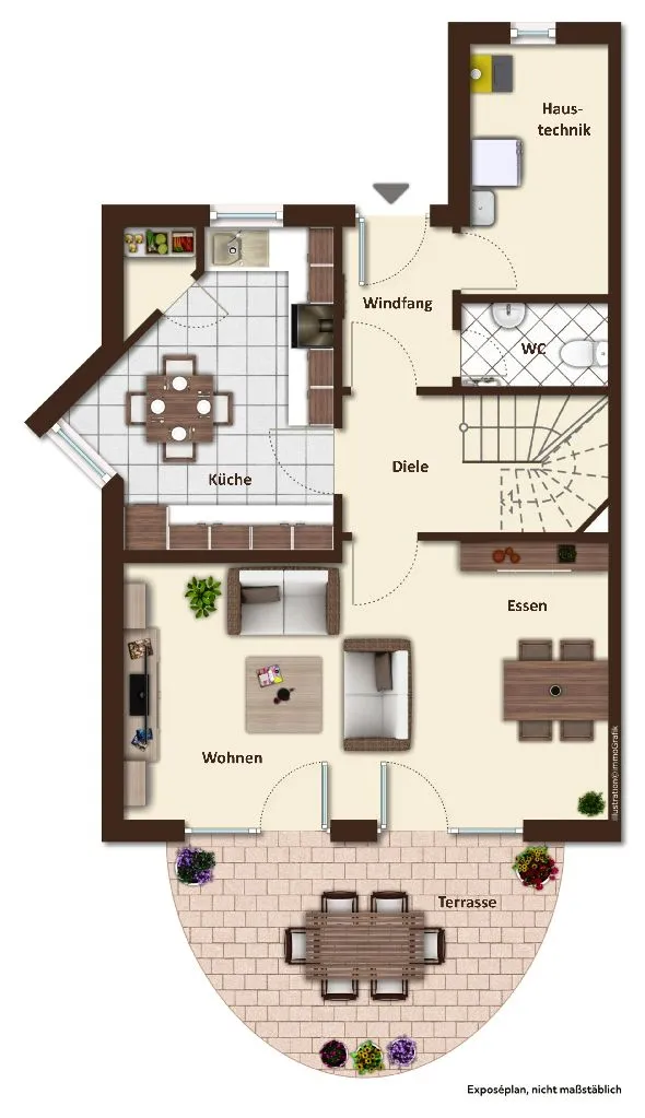 Das gartenseitig nach Südwesten ausgerichtete Domizil verfügt auf der Eingangsebene über ein helles und freundliches Flächenangebot mit geräumiger Küche, einem Wohn-/Esszimmer mit Südterrasse sowie dem Gäste-WC. Desweiteren finden Sie angrenzend an den Windfang - im Technik- und Abstellraum - die Unterbringungsmöglichkeit für Vorräte, die Anschlüsse für Waschmaschine und Trockner, die Heizung sowie die Elektroverteilung vor. Einen Platz für die Garderobe steht im zentralen Treppenhausbereich zur Verfügung, von dem aus die weiteren Etagen erschlossen werden.