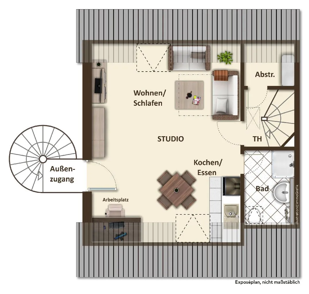 Grundrisse: Bei den in den Grundrissplänen (Prospektzeichnungen) eingezeichneten Möbeln und Ausstattungsgegenständen (z. B. Waschmaschine, Trockner, Sanitärausstattung, o. Ä.) handelt es sich um Einrichtungs- und Gestaltungsvorschläge, die nicht mit den vor Ort vorhandenen Gegebenheiten übereinstimmen müssen. Sie sind kein Bestandteil des Angebotes, und somit ohne konkreten Hinweis nicht im Kaufpreis enthalten. Sie dienen lediglich der Darstellung der Lage und ungefähren Größe der Räumlichkeiten. Für eventuell eingetragene Maße übernehmen wir keine Gewähr.