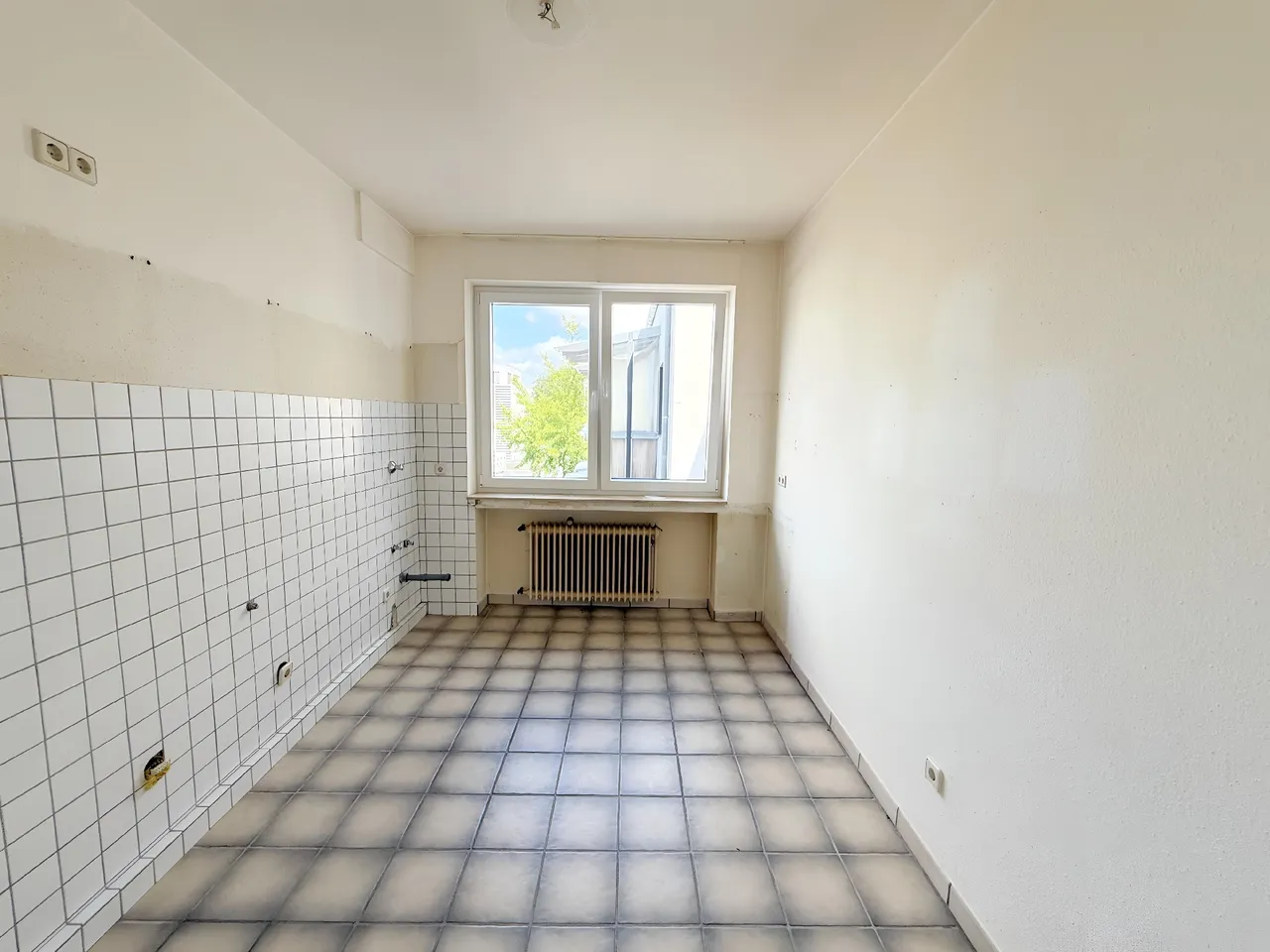 Das ruhig gelegene Schlafzimmer überzeugt durch seine angenehme Größe und eine freundliche Helligkeit. Die separate Küche mit klassischen Wandfliesen bietet genügend Platz für eine individuelle Küchengestaltung.