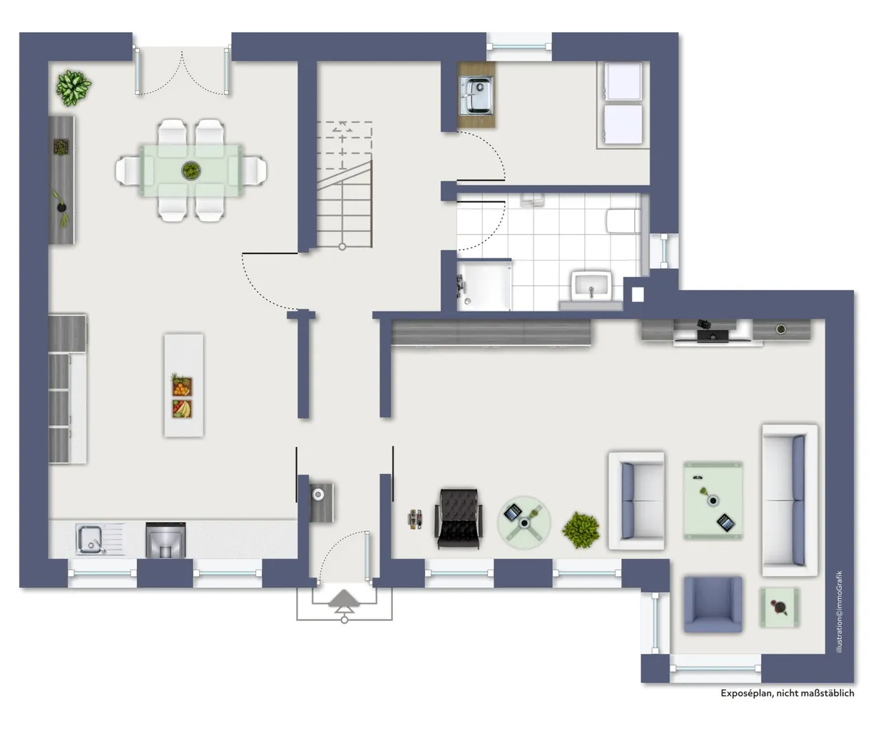 Zentraler Treffpunkt des Hauses ist die ca. 30 m² große Wohnküche mit einer exklusiven Einbauküche und Miele-Geräten - offen, elegant und perfekt für gemeinsames Kochen und Leben. Ein Hauswirtschaftsraum im Erdgeschoss ergänzt das durchdachte Raumangebot sinnvoll.