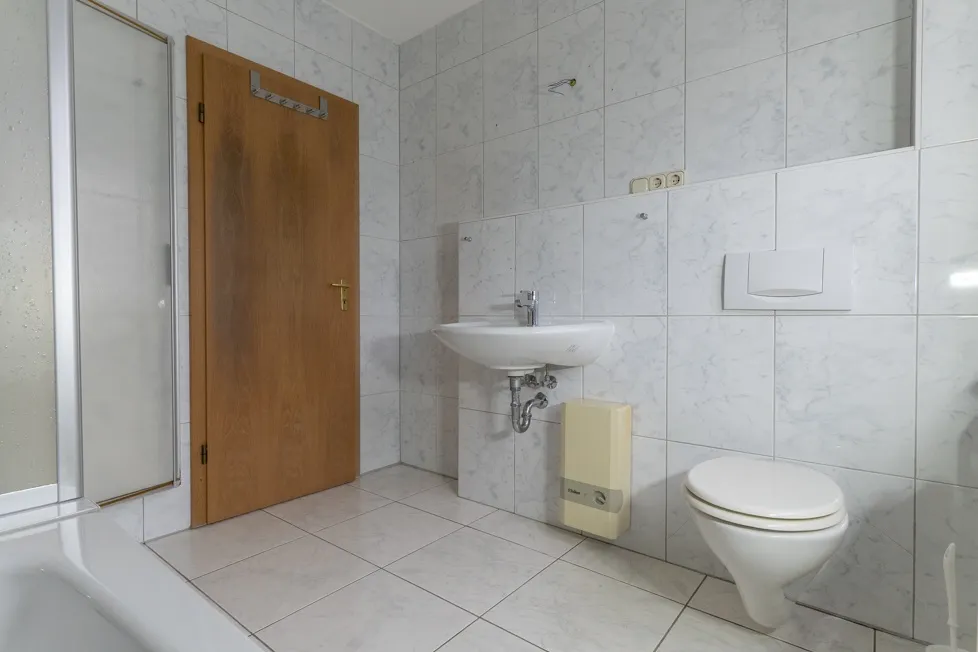 Den Abschluss bilden das Tageslichtbad mit Wanne und Dusche sowie das innenliegende Gäste-WC.