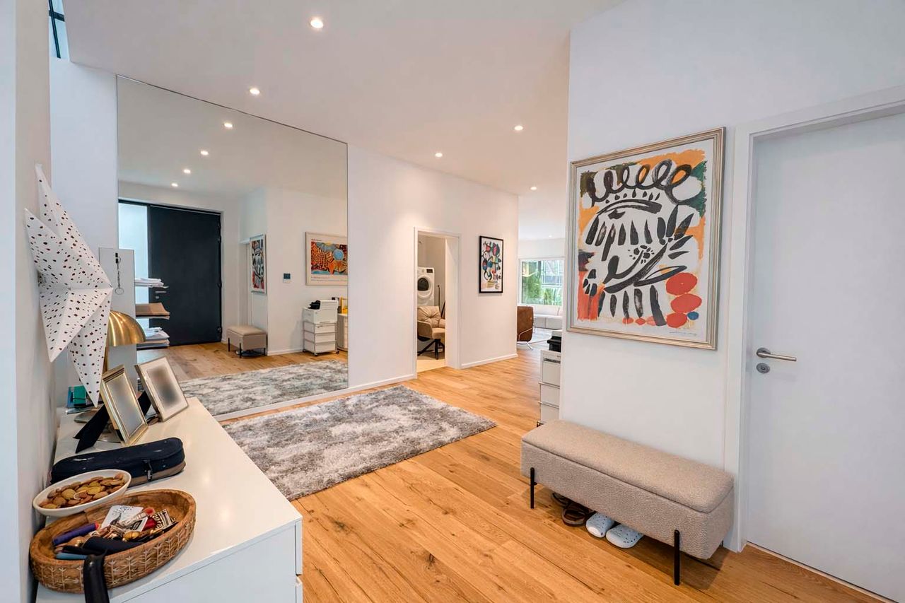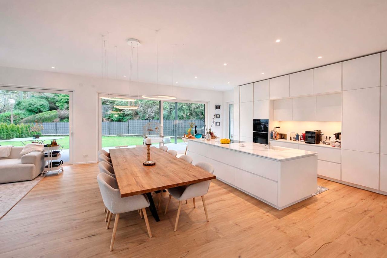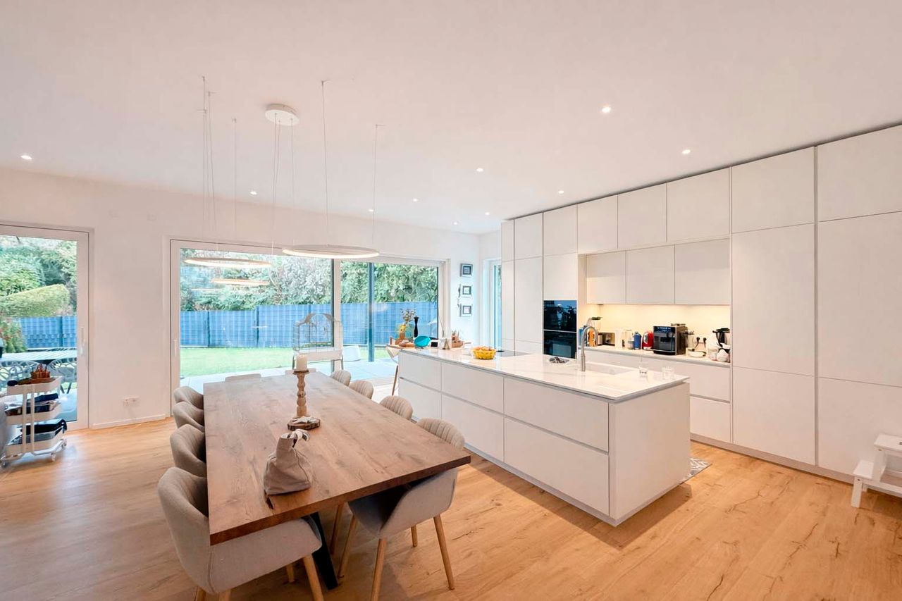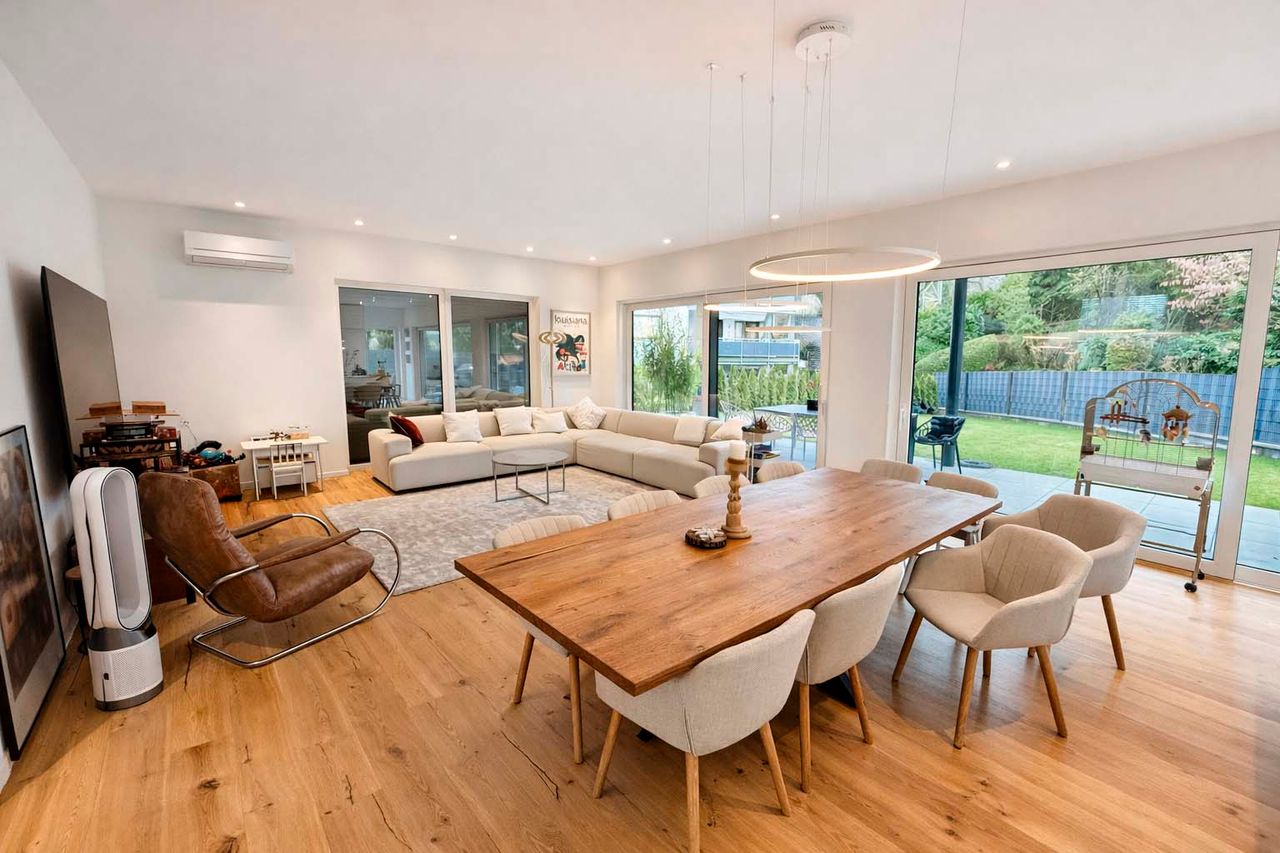 Der offen gestaltete Wohn- und Essbereich mit bodentiefen Fensterflächen schafft ein elegantes und zugleich behagliches Ambiente. Edles Kährs-Parkett, italienische Fiandre-Fliesen in Studio und Nasszellen sowie eine stilvolle Innen- und Außenbeleuchtung von Bega unterstreichen den gehobenen Anspruch. Die maßgefertigte Küche mit Miele-Geräten, Bora-Kochfeld und Quooker-System wird durch eine hochwertige Garderobe und Ankleide von Steeg Wohnconcept ergänzt.