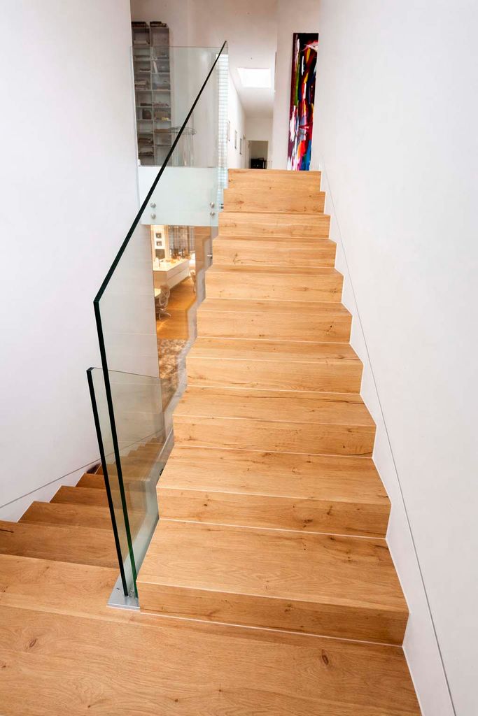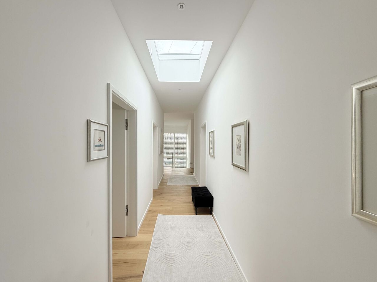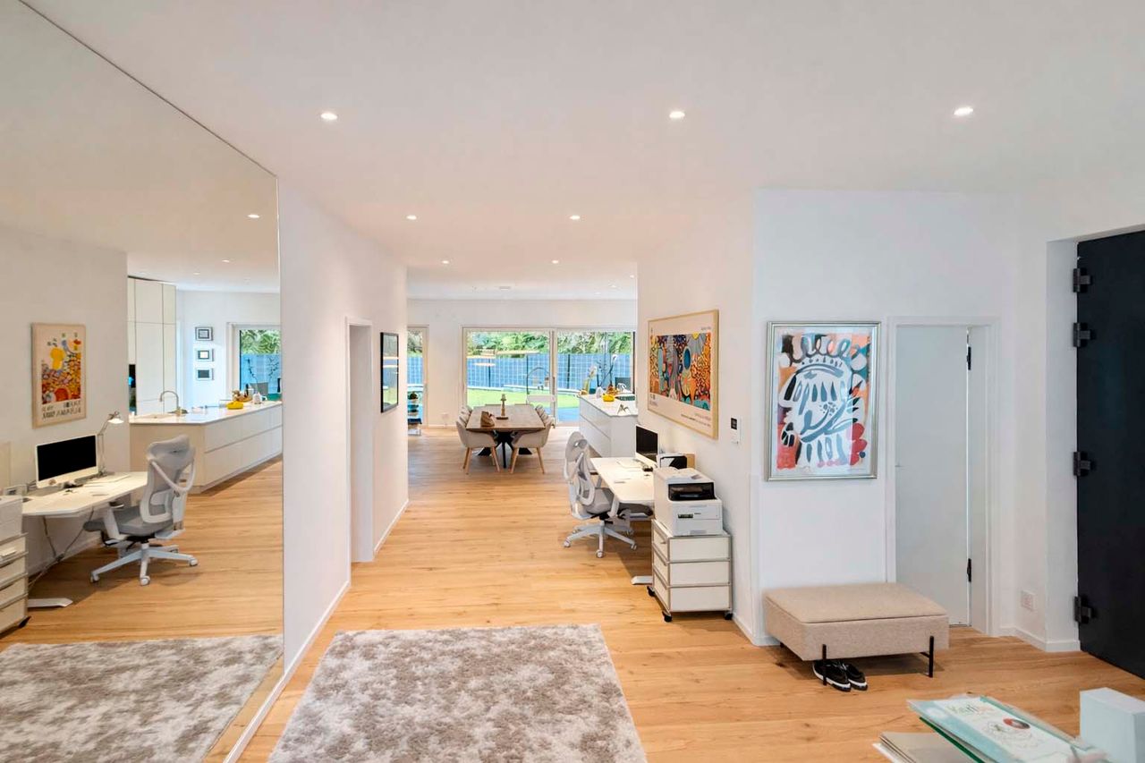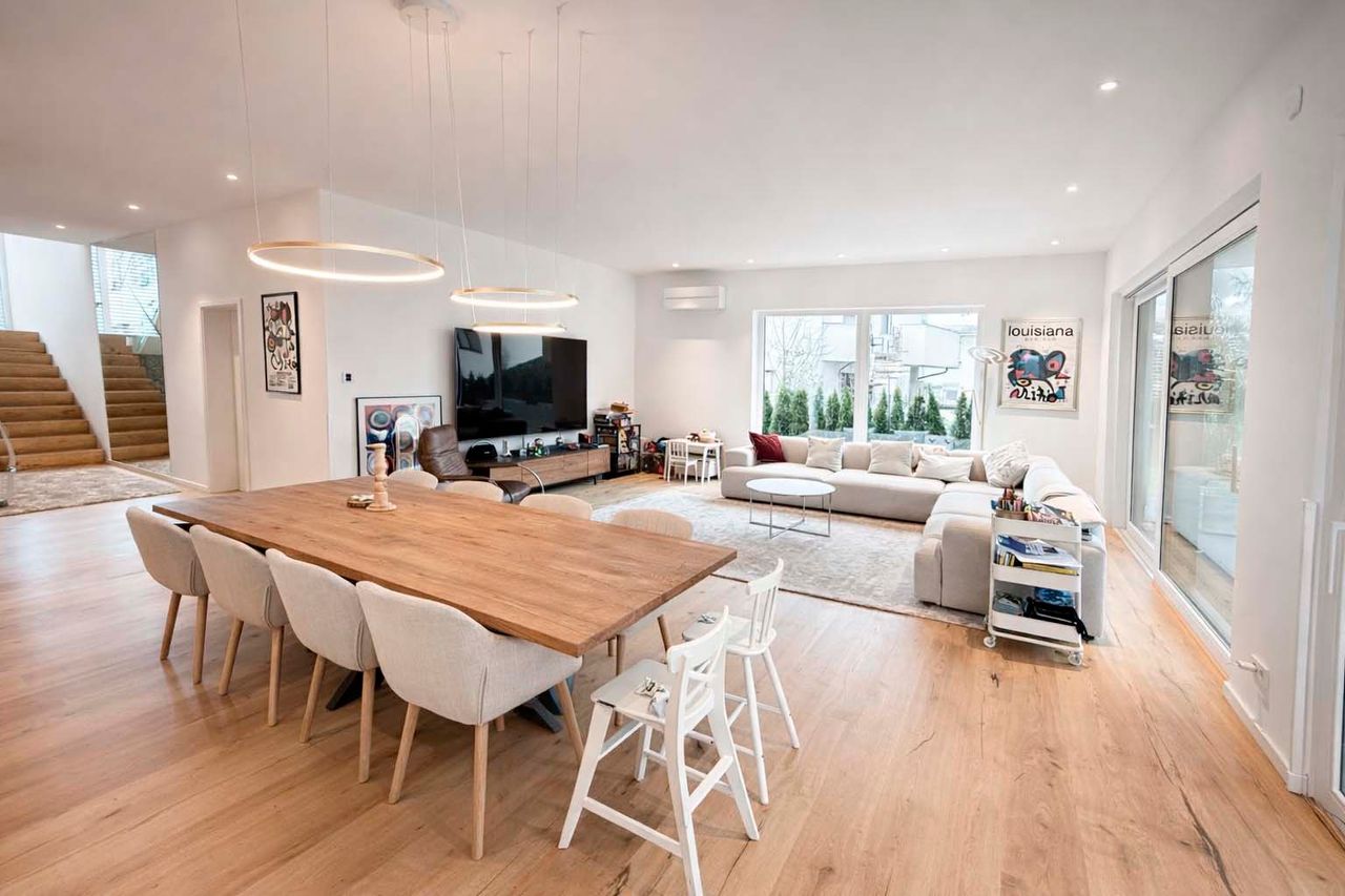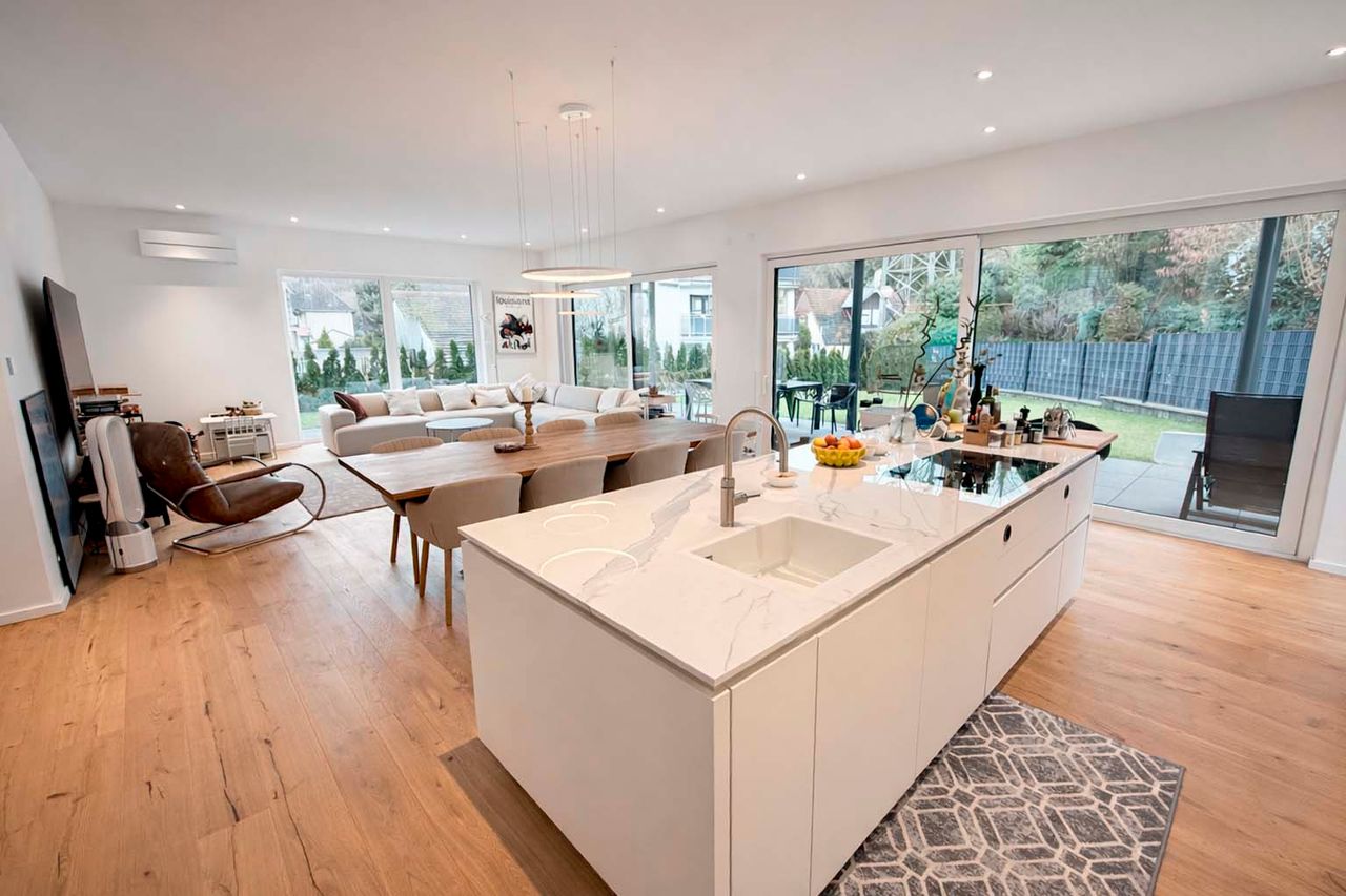Der offen gestaltete Wohn- und Essbereich mit bodentiefen Fensterflächen schafft ein elegantes und zugleich behagliches Ambiente. Edles Kährs-Parkett, italienische Fiandre-Fliesen in Studio und Nasszellen sowie eine stilvolle Innen- und Außenbeleuchtung von Bega unterstreichen den gehobenen Anspruch. Die maßgefertigte Küche mit Miele-Geräten, Bora-Kochfeld und Quooker-System wird durch eine hochwertige Garderobe und Ankleide von Steeg Wohnconcept ergänzt.