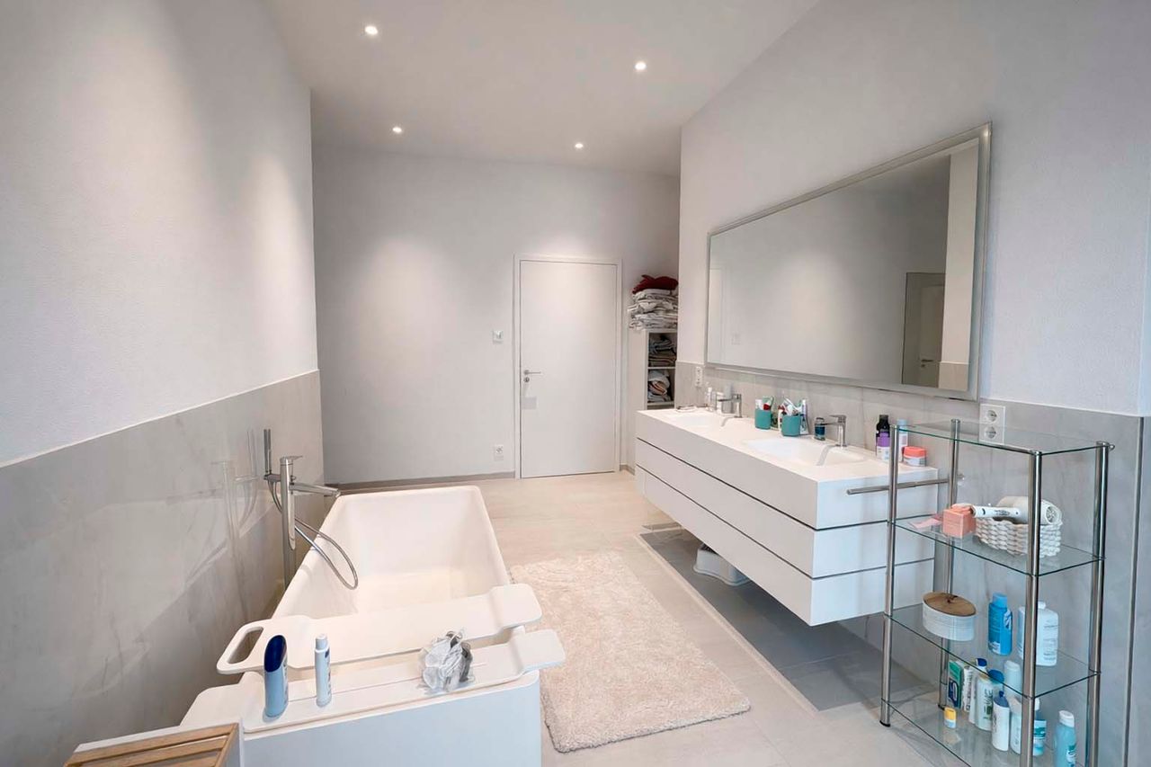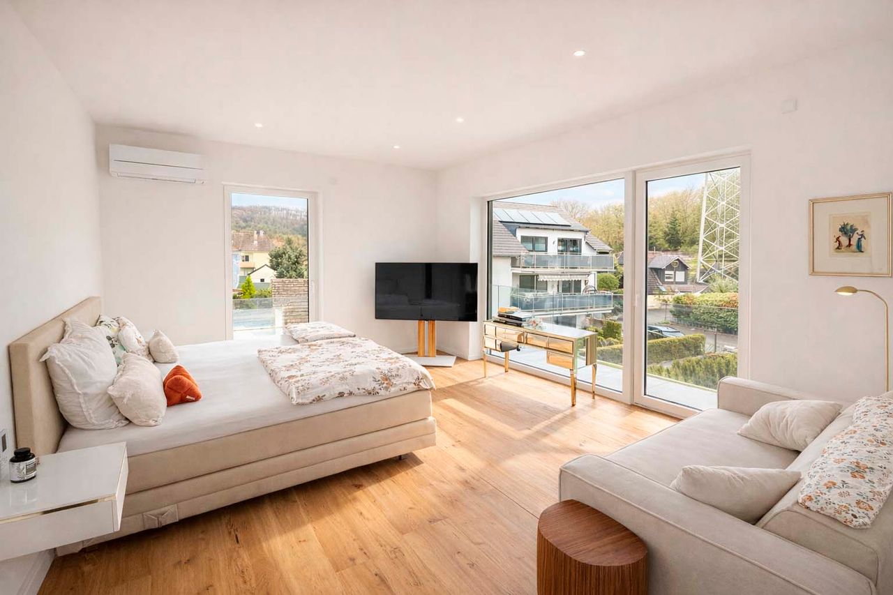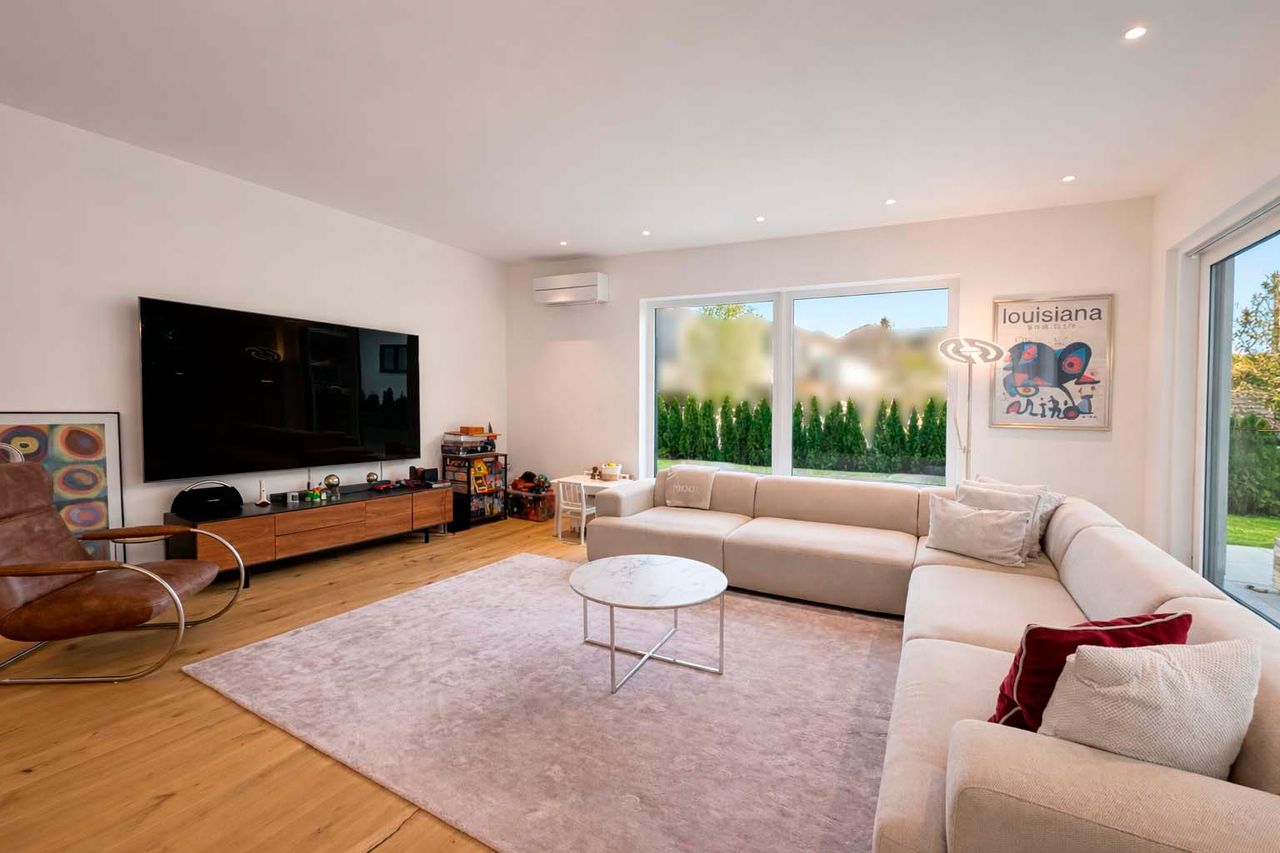 Auch technisch überzeugt die Immobilie: Photovoltaikanlage mit ca. 15 kWp und Huawei-Speicher, Buderus-Wärmepumpe, KNX-Smart-Home-System, Alarmanlage, dreifach verglaste Sondermaß-Fenster, Velux-Dachfenster mit Regensensor sowie Klimatisierung von Wohnbereich, Studio und Schlafzimmern. Hochsicherheits-Hauseingangstüren, Fertigbetondecken, zwei Satellitenanlagen und ein elektrisches Hörmann-Garagentor runden die hochwertige Ausstattung ab.