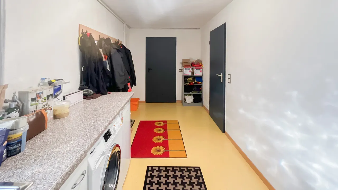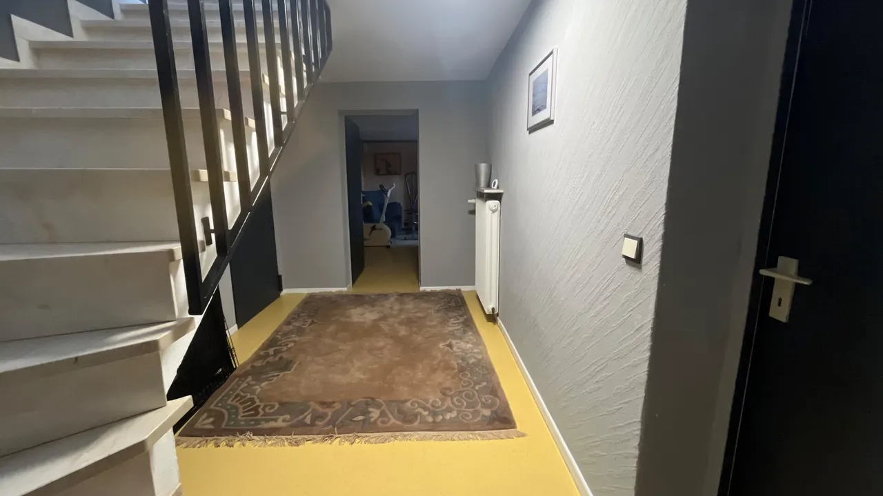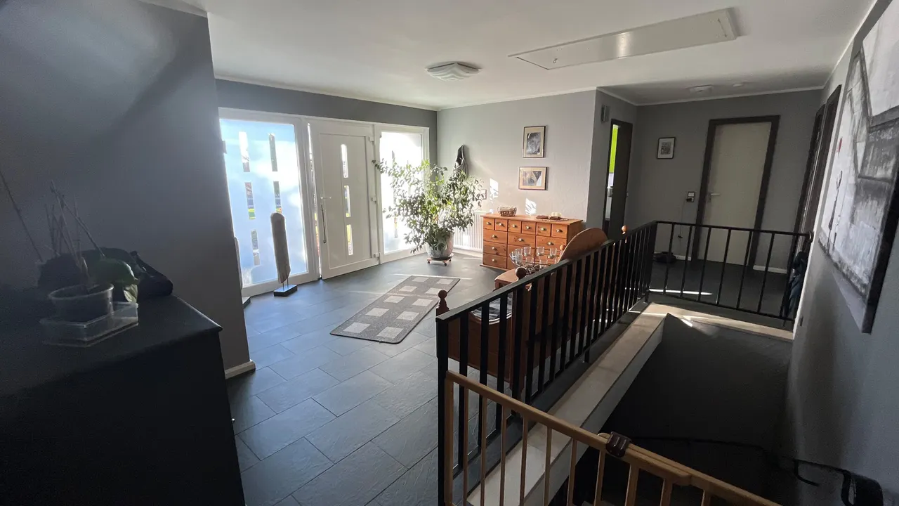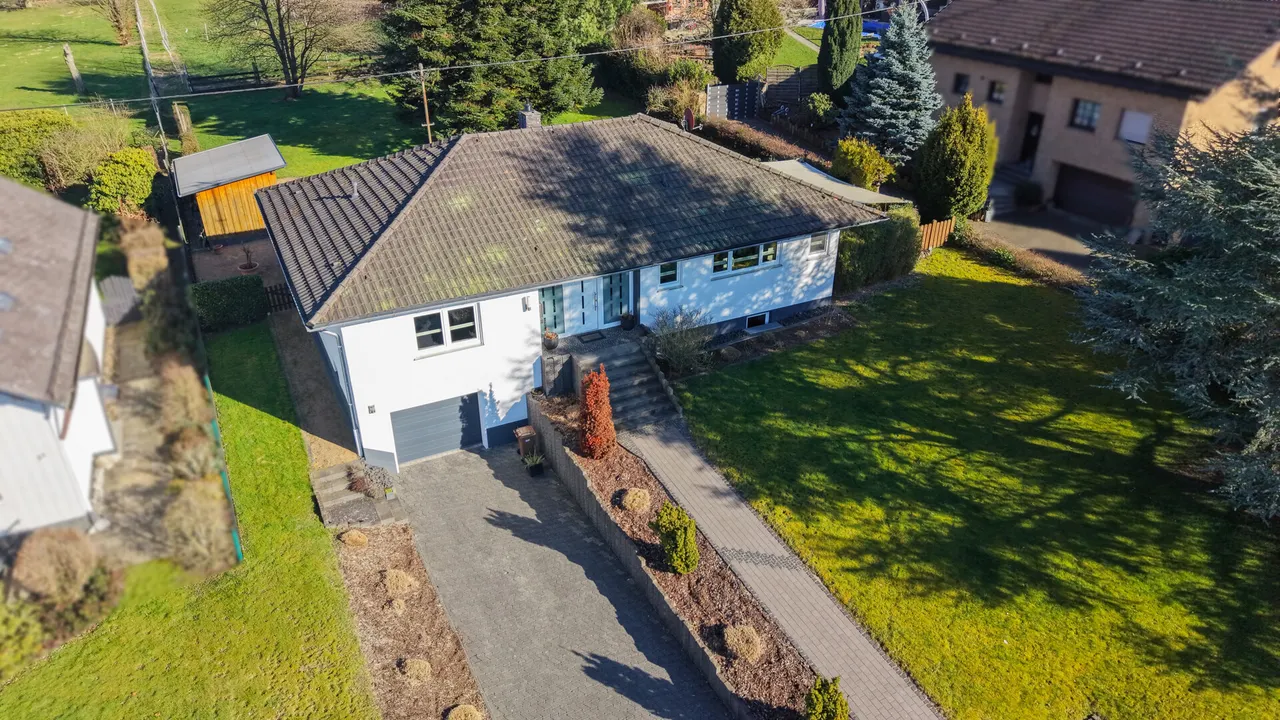 Dieser charmante Bungalow bietet komfortables Wohnen mit insgesamt fünf gut geschnittenen Zimmern. Bereits beim Betreten empfängt Sie eine große Diele, die einen einladenden Eingangsbereich schafft. Das Raumangebot umfasst ein Schlafzimmer, ein separates Gästezimmer sowie eine Ankleide und ein Arbeitszimmer. Ergänzt wird der Grundriss durch eine helle Küche mit angenehmer Atmosphäre, ein Badezimmer sowie ein zusätzliches Gäste-WC für Komfort im Alltag. Herzstück des Hauses ist das großzügige und lichtdurchflutete Wohn- und Esszimmer mit direktem Zugang zur Terrasse und dem beeindruckenden Grundstück. Die große Gartenfläche eröffnet vielfältige Gestaltungsmöglichkeiten und bietet viel Raum für Erholung, Freizeit und Naturgenuss. Der Bungalow ist voll unterkellert und bietet dadurch umfangreiche Nutzflächen. Im Untergeschoss befinden sich die Garage, eine Waschküche, ein Hobbyraum mit integrierter Bar sowie weitere Kellerräume mit viel Stauraum.