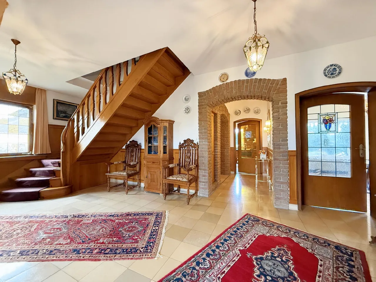 Beim Betreten der Villa befinden Sie sich in einem großzügigen, hellen Eingangsbereich. Eine gewendelte Holztreppe führt Sie von hier ins erste Obergeschoss, maßangefertigte Einbauschränke bieten viel Stauraum und eine farbenfrohe Bleiverglasung bildet einen charmanten Hingucker. Der Eingangsbereich führt Sie zur Rechten in ein rund 40 m² großes Wohnzimmer mit tollem Blick in den eigenen Garten. Große Fensterfronten sowie eine Doppelflügeltür zur Terrasse lassen viel Tageslicht in den mit Stäbchenparkett ausgelegten Raum einfallen. Die südlich ausgerichtete Terrasse kann zu einem großen Teil mit einer elektrischen Markise beschattet werden. Angrenzend an den Wohnbereich befindet sich ein geräumiges Esszimmer, durch welches Sie in die Küche gelangen. Um den Grundriss des Hauses an die heutigen Wohnanforderungen anzupassen, wäre eine Verbindung der beiden Räume mittels eines Durchbruchs überlegenswert.
