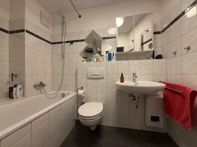 Hell gefliestes Badezimmer mit Wannenbad, WC und Waschbecken