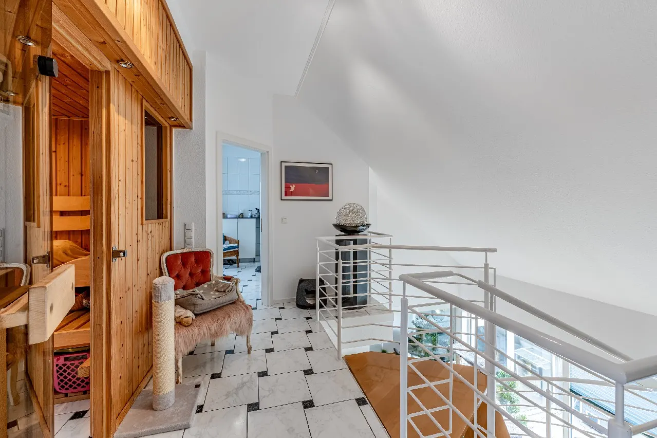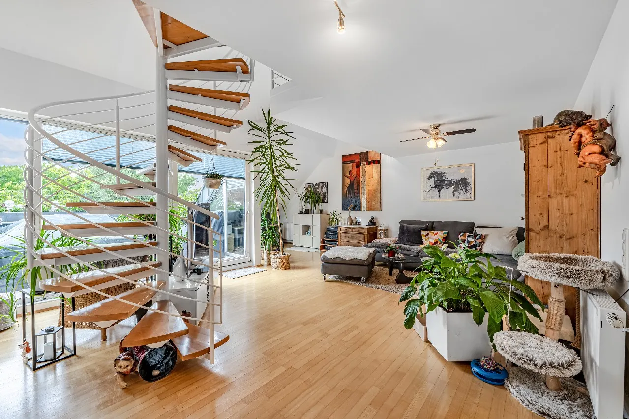 Eine filigrane Wendeltreppe führt ins Galeriegeschoss. Hier beeindruckt besonders der offene Galeriebereich mit Blick in das darunterliegende Geschoss – die großzügige Deckenhöhe und der Lichteinfall schaffen ein luftiges, beinahe loftartiges Wohngefühl. Das Galeriegeschoss beherbergt ein geräumiges Elternschlafzimmer mit praktischen Einbauschränken sowie ein Tageslichtbad mit Dusche und Eckbadewanne. Ein weiterer, ursprünglich als Kinder- oder Gästezimmer geplanter Raum wird als private Sauna und Ruhezone genutzt. Ein Rückbau zur Nutzung als Büro oder Kinderzimmer ist auf Wunsch ohne großen Aufwand möglich. Von hier aus gelangen Sie direkt auf den zweiten, uneinsehbaren Balkon mit weitem Blick ins Grüne. Ein Rückzugsort mit echter Wellness-Qualität. Ein kleiner Abstellraum in der Dachschräge komplettiert die Wohneinheit.