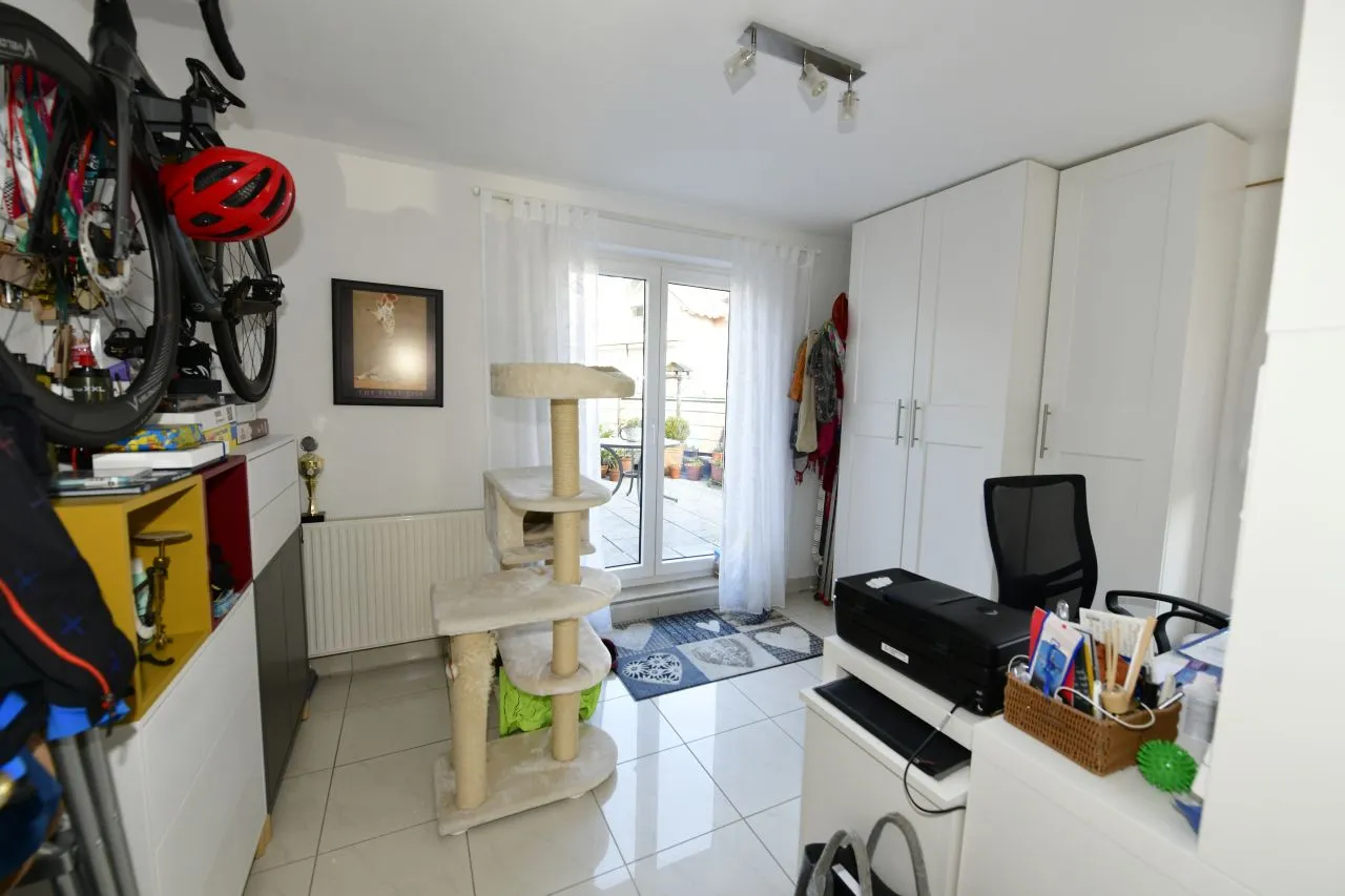 Die Wohnfläche beläuft sich auf ca. 78 m² und verteilt sich mit ca. 14,08 m² auf die sehr großzügige Terrasse (Grundfläche ca. 40 m²), auf der es sich richtig gemütlich feiern lässt ohne Platzprobleme für Sie und Ihre Gäste. Die Terrasse wird entweder über das lichtdurchflutete ca. 13,41 m² große Elternschlafzimmer oder das ca. 11,43 m² große Kinderzimmer betreten.