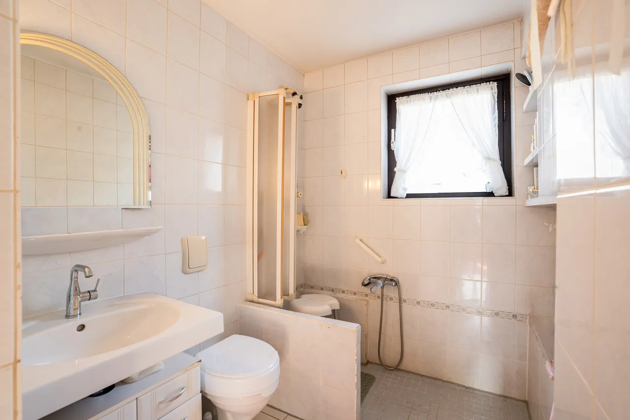 Das Haus besteht aus zwei baugleichen Wohneinheiten im Erd- und Obergeschoss und eignet sich sowohl für Eigennutzer als auch für Kapitalanleger oder Mehrgenerationenwohnen. Beim Betreten einer der Wohnungen gelangt man zunächst in den zentralen Flur, von dem aus alle Räume bequem erreichbar sind. Rechts am Ende des Flurs befindet sich die Küche, welche gut geschnitten ist und ausreichend Platz für eine moderne Küchenlösung bietet. Daneben liegt das Badezimmer, ausgestattet mit Dusche, WC und Waschbecken, das kompakt gestaltet ist und Raum für eine zeitgemäße Neugestaltung bietet.