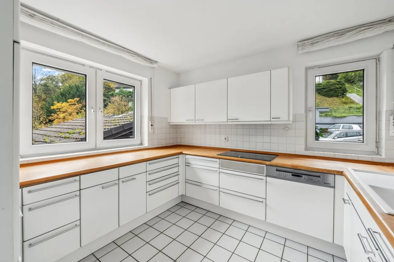 - Einbauküche mit Elektrogeräten u. a. von Marken wie Miele und Neff