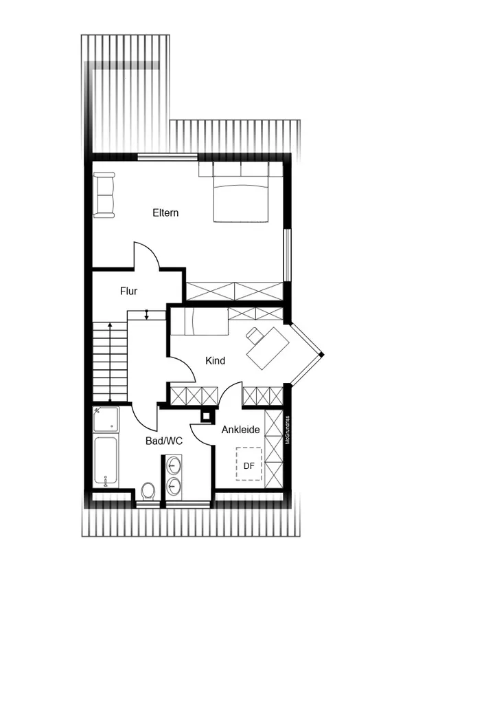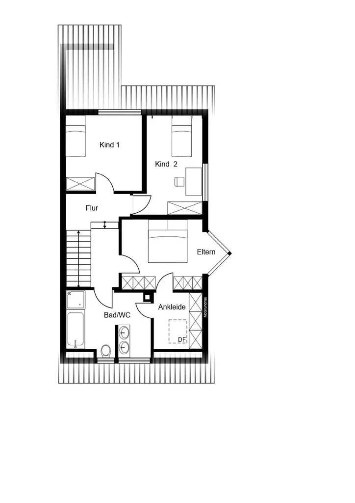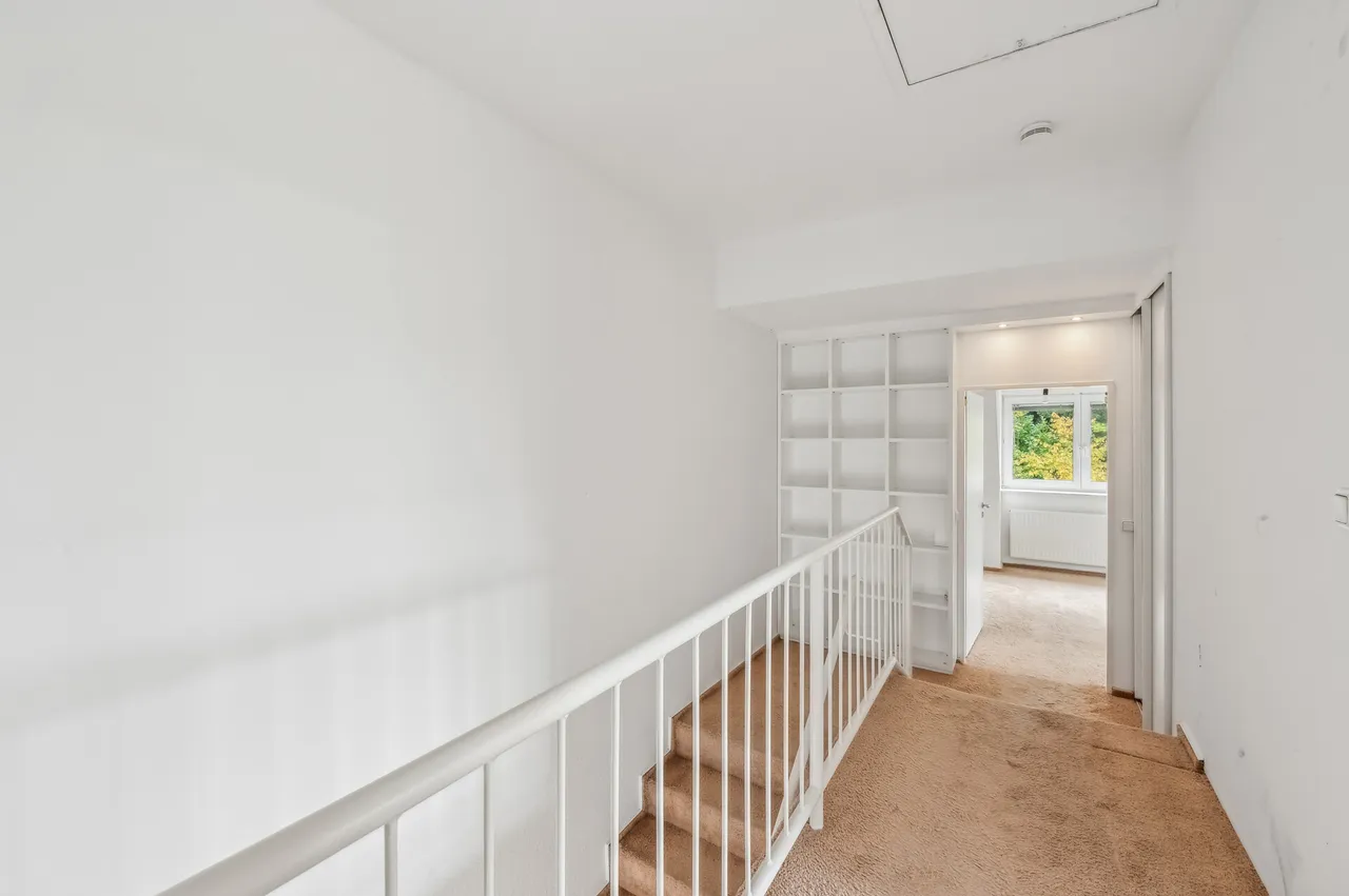 Im Dachgeschoss verbindet ein Flur alle weiteren Räume. Dazu zählt auch das große Badezimmer, welches sowohl eine Dusche als auch eine Badewanne bietet. Dieses Badezimmer, und auch das Gäste-WC im Erdgeschoss, sind mit Tageslichtfernstern ausgestattet. Die anderen Räume können beispielsweise als Kinder- und Schlafzimmer genutzt werden. Auf dieser Etage ist außerdem Teppichboden verlegt.