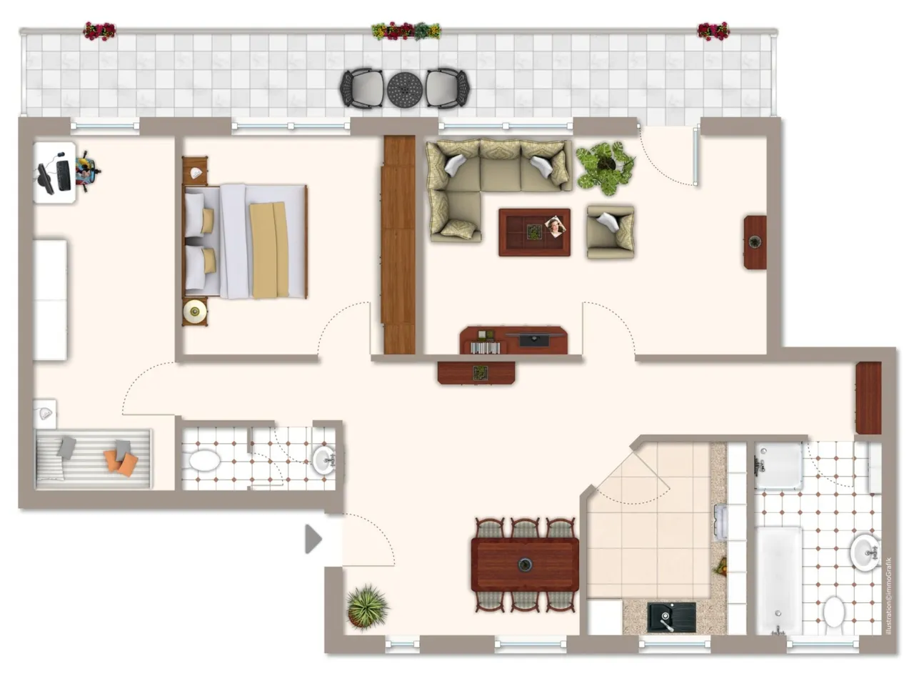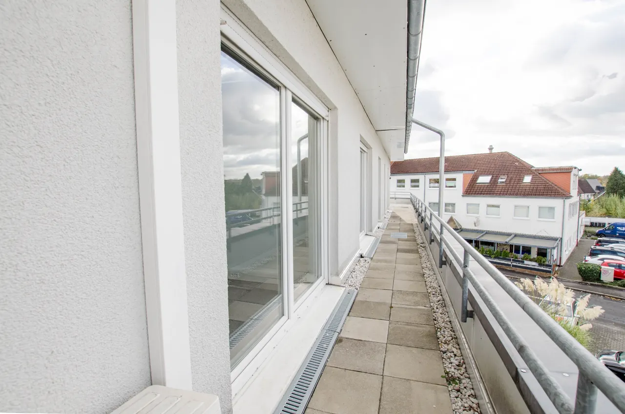 Die Wohnung verfügt über keinen Balkon, wohl aber über einen Laubengang den Sie für gemütliche Stunden an der Sonne nutzen können. Die Wohnung ist mit einem Aufzug bequem erreichbar und bietet zwei eigene PKW-Stellplätze sowie eine Garage, die zusätzlichen Stauraum oder Platz für Ihr Fahrzeug bietet.