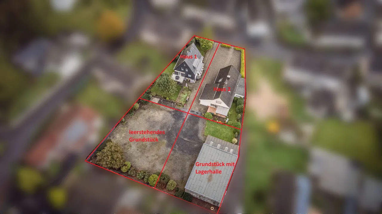 Die zwei hinteren Grundstücke, eines davon mit Lagerhalle, können eigenständig genutzt, bebaut oder